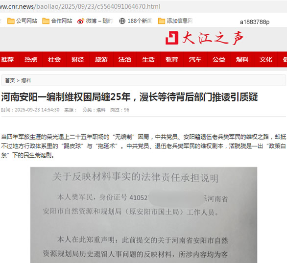 当四年军旅生涯的荣光遇上二十五年职场的“无编制”困局,中共党员、安阳籍退伍老兵樊军民的维权之路,却抵不过地方行政体系里的“踢皮球”与“拖延术”。中共党员、退伍老兵樊军民的维权剧本,活脱脱是一出“政策白条”下的民生荒诞剧。