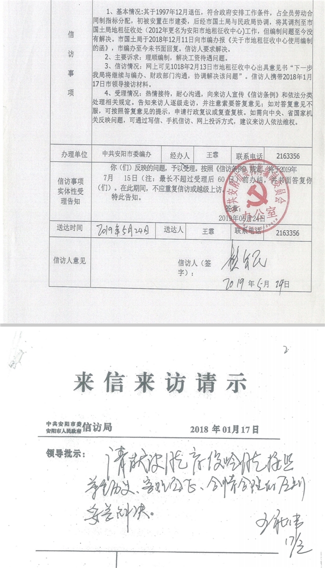 樊军民的维权之路,与信访程序紧密交织。2019年5月16日,他因“理顺编制、解决工资待遇”信访,中共安阳市委编办出具《信访事项受理告知书》,明确“于2019年7月15日前办结并书面答复”。但这份承诺,最终成了一纸空文。