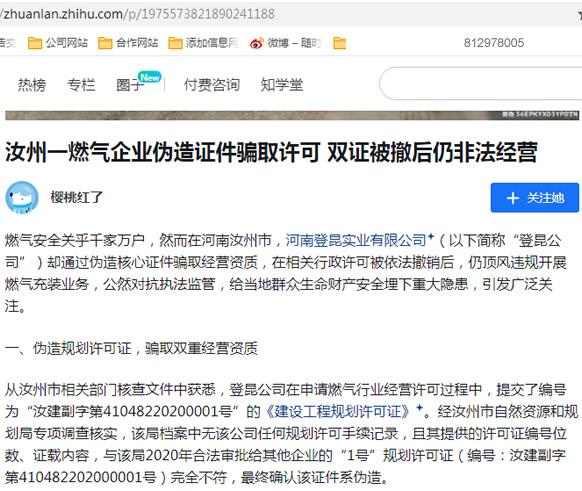 汝州一燃气企业伪造证件骗取许可 双证被撤后仍非法经营